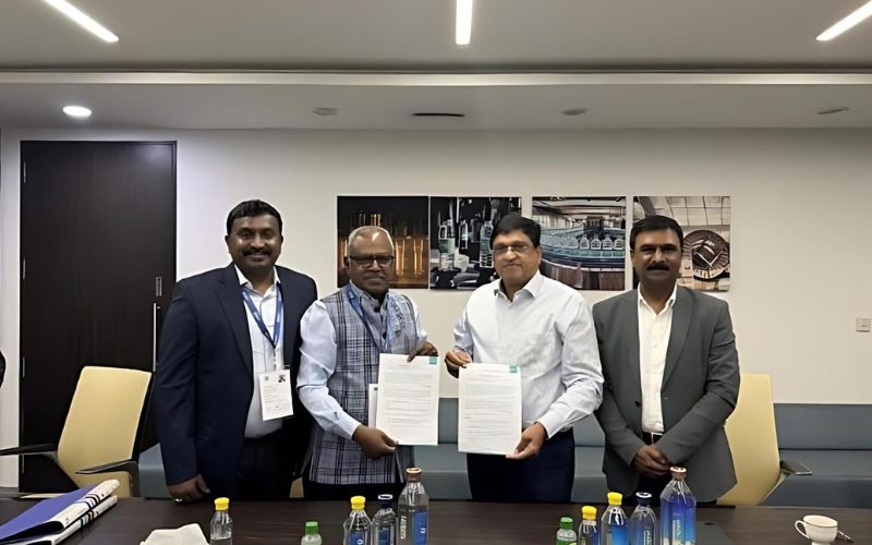 The MoU was signed by Angelo George, CEO of Bisleri International, and Sankar K, Chairman of Shree Renga Polyester, in the presence of K. Ganesh, Head of Sustainability and CSR at Bisleri International, and Senthil Sankar, Managing Director of Shree Renga Polyester and Co-founder of EcoLine Clothing.