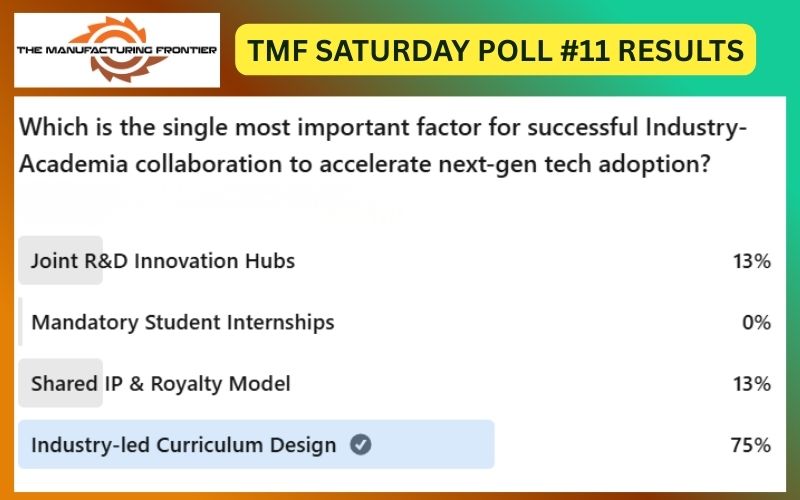 The results of the recent TMF Saturday Poll #11 have delivered a resounding, almost unanimous verdict that shifts the spotlight in the industry-academia collaboration debate. The question: “Which is the single most important factor for successful Industry-Academia collaboration to accelerate next-gen tech adoption?” yielded a clear winner: Industry-led Curriculum Design, securing a staggering 75% of the votes.