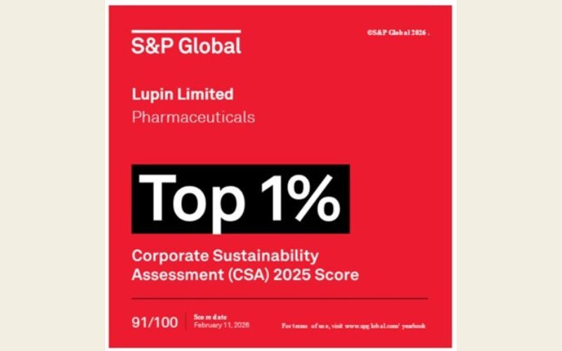 Global pharma major Lupin Limited has announced its recognition among the top 1% of companies worldwide in the S&P Global Corporate Sustainability Assessment (CSA). Lupin attained a score of 91 out of 100, establishing itself as the leading pharmaceutical company globally, and the leader across all sectors in India, surpassing both Indian and international peers.