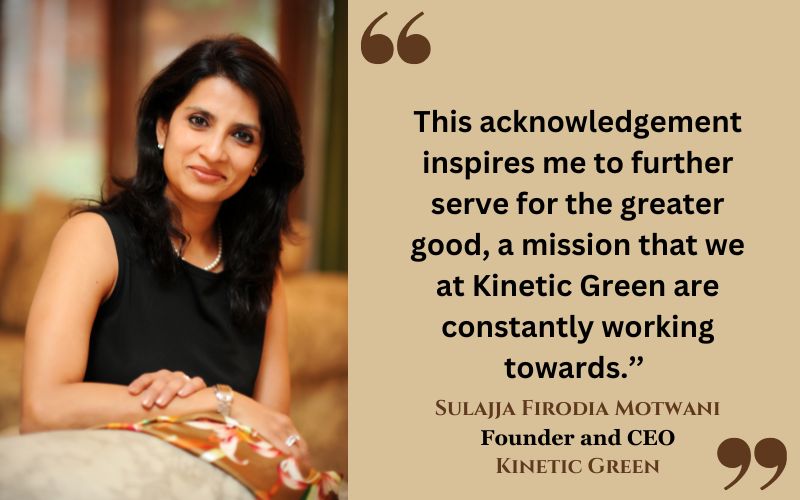 Commenting on the occasion, Sulajja Firodia Motwani, Founder and CEO, Kinetic Green said, ‘’I am deeply humbled and honored to receive this recognition. The Firodia family has always by synonymous with strong values, nation building, self-reliance and a deep-rooted sense of nationalism. This acknowledgement inspires me to further serve for the greater good, a mission that we at Kinetic Green are constantly working towards.’’