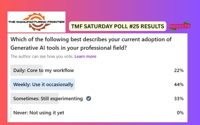 When we launched last week’s The Manufacturing Frontier Saturday Poll, we wanted to gauge how deeply Generative AI has actually penetrated the professional workflows of our community. The results tell a compelling story of a workforce in transition, moving rapidly from curiosity to competence.